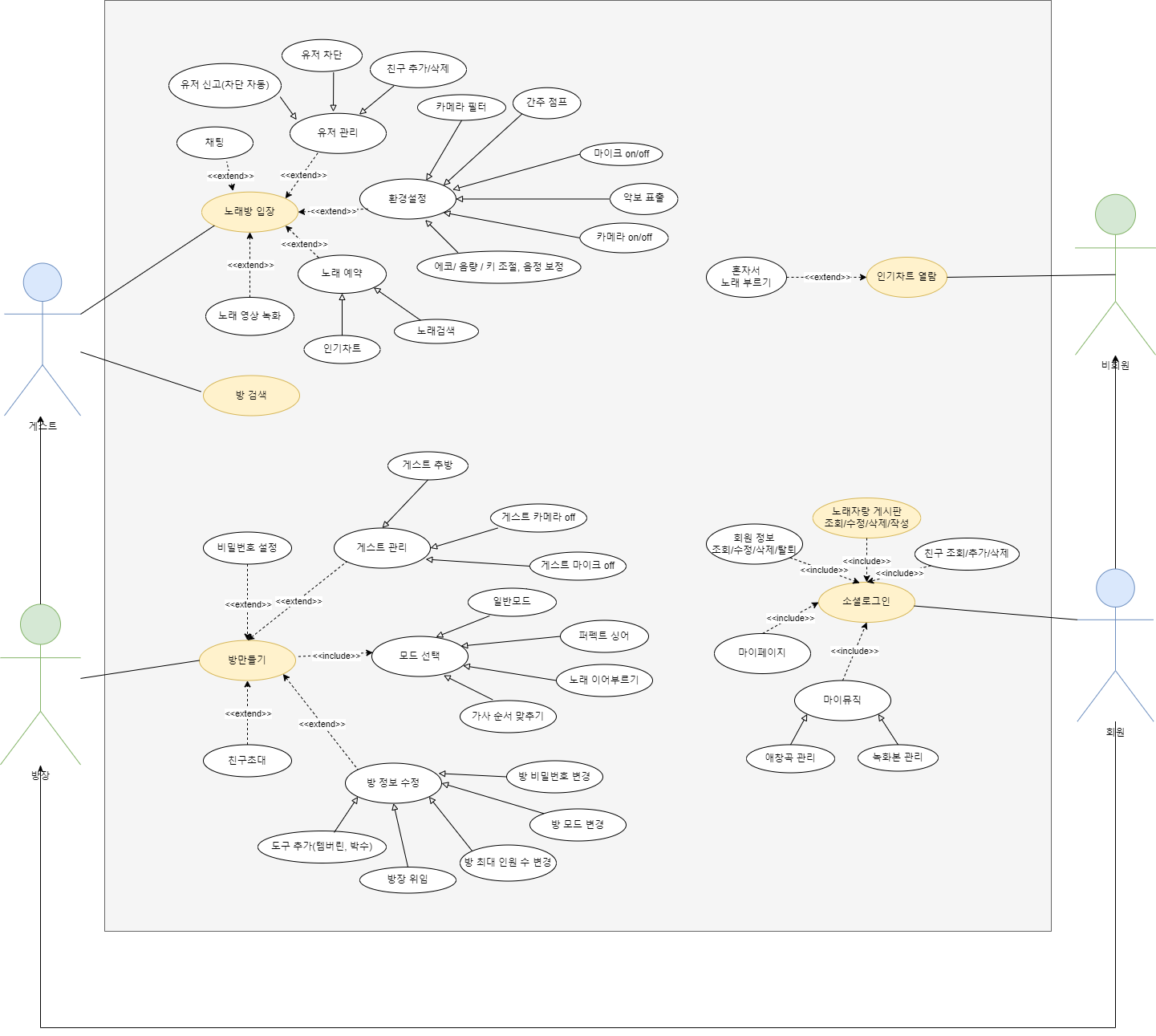 1. 초대하기 2. 친구 추가 3. 노래 예약 4. 채팅창 5. 마이크 온/오프 6. 카메라 온/오프 7. 유저 차단 8. 화면 캐릭터화 (딥페이크?) |